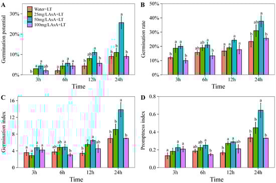 Effects of AsA priming at different concentrations and times on cotton seed germination. Note: The effects of AsA priming on germination potentials (A), germination rates (B), germination index (C), and promptness index (D). Values are means ± SD of five biological replicates (n = 5). Different lowercase letters indicate statistically significant differences among treatments at p < 0.05 according to one-way ANOVA followed by Duncan’s multiple range test.