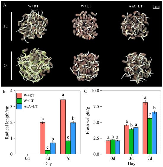 According to the above results, three distinct treatments for cotton seed germination were conducted to evaluate the effects of AsA priming and temperature conditions on seed vigor and germinative performance. The treatments were designed as follows: (i) W+RT (seeds soaked in distilled water for 24 h and continuously germinated at a root temperature of 25 °C); (ii) AsA+LT (seeds primed with the optimal AsA priming conditions for 24 h and then germinated at a low temperature of 15 °C), and (iii) W+LT (seeds soaked in distilled water for 24 h at room temperature and then germinated at a low temperature of 15 °C). Large differences were observed among the cotton seeds in various stages of development, from germination to the establishment of roots (Figure 2A). By the third day of seed germination, the performance of seeds germinated at 25 °C was indeed significantly (p < 0.05) superior to that of seeds germinated at 15 °C. Specifically, both the radicle length (RL) and the fresh weight (FW) of seeds germinated at 25 °C were substantially greater than those of seeds germinated at 15 °C. Under the germination conditions at 15 °C, the AsA+LT treatment demonstrated a markedly higher enhancement in seed growth indicators compared to the W+LT treatment. Specifically, on the 3rd day of germination, the FW and RL increased by 6.00% and 200.00%, respectively, in the AsA+LT treatment when compared to the W+LT treatment. By the 7th day of germination, these enhancements were even more pronounced, with increases of 17.67% for FW and an impressive 136.26% for RL. Therefore, the beneficial effects of AsA priming on cotton seed germination are especially evident under low-temperature conditions.