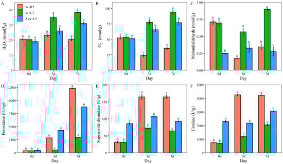 Low-temperature stress triggers excessive ROS, including H2O2 and O2−, in plants, causing cellular damage, including DNA, protein, and membrane destruction, along with lipid peroxidation and MDA accumulation, which compromises cell stability. Under W+RT treatment, ROS (H2O2 and O2−) and MDA levels in cotton seeds remained stable, indicating balanced oxidative metabolism. In contrast, W+LT treatments significantly (p < 0.05) disrupted this balance, sharply increasing H2O2, O2−, and MDA levels by 67.63%, 190.02%, and 180.76%, respectively (Figure 3A–C), leading to severe oxidative damage during germination. Exogenous AsA pretreatment effectively alleviated these adverse effects: compared to the W+LT group, AsA treatment reduced H2O2 and O2− levels by 22.10% (Figure 3A) and 16.94% (Figure 3B), respectively, and significantly (p < 0.05) inhibited lipid peroxidation, lowering MDA accumulation by 58.90% (Figure 3C). Simultaneously, AsA priming enhanced antioxidant enzyme activities, including POD, SOD, and CAT. Under room temperature, activities increased by 10.9%, 176.56%, and 209.29%, respectively, before germination (Figure 3D–F). Under low-temperature stress, AsA further elevated POD, SOD, and CAT activities by 686.16%, 46.99%, and 84.04% on day 3, with POD showing the most substantial rise, and maintained higher levels through day 7 (196.74%, 43.81%, and 49.43%, respectively). These findings suggest that AsA enhances antioxidant defense, blocks ROS chain reactions, and protects cell membrane integrity, thereby improving cotton seed germination under low-temperature stress.