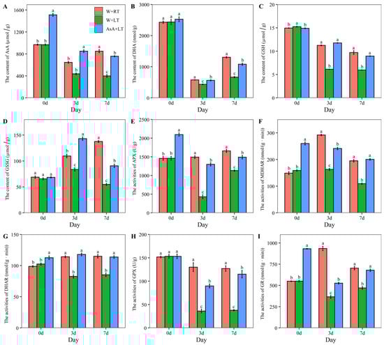 Effects of the suitable AsA priming on the contents of metabolites and enzyme activities in the AsA-GSH cycle. Note: The effects of AsA priming on the contents of AsA (A), DHA (B), GSH (C), and GSSG (D), and the enzyme activities of APX (E), MDHAR (F), DHAR (G), GPX (H), and GR (I). Values are means ± SD of five biological replicates (n = 5). Different lowercase letters indicate statistically significant differences at p < 0.05 according to one-way ANOVA followed by Duncan’s multiple range test.