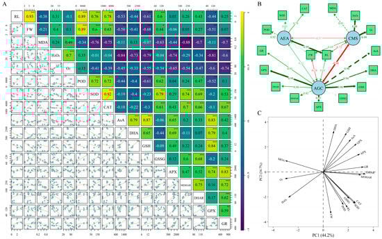 Analysis of the interrelationships among cell membrane stability, antioxidant enzyme activity, and the AsA-GSH cycle during cold-resistant germination of cotton seeds. Note: (A) Correlation matrix showing the pairwise relationships among seedling traits (RL, radicle length; FW, fresh weight), cell membrane stability indicators (MDA, H2O2, O2−), antioxidant enzyme activities (POD, SOD, CAT), metabolites in the AsA-GSH cycle (AsA, DHA, GSH, GSSG), and the related enzyme activities (APX, MDHAR, DHAR, GPX, GR). * means that p ≤ 0.05, ** means that p ≤ 0.01, and *** means that p ≤ 0.001. (B) Structural equation modeling (SEM) illustrating the direct and indirect effects of antioxidant enzyme activity (AEA), cell membrane stability (CMS), and the AsA-GSH cycle (AGC) on cold-resistant germination. Green arrows represent positive effects, red arrows represent negative effects, and line thickness indicates effect strength. Numbers beside arrows represent standardized path coefficients; arrow thickness indicates effect strength; solid arrows denote significant paths (p < 0.05 or p < 0.01), whereas dashed arrows denote less significant or nonsignificant paths (p ≥ 0.05). (C) Principal component analysis (PCA) showing the distribution and contributions of different physiological and biochemical parameters to germination variation.