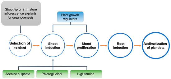 16]. There are four stages to undertake direct shoot organogenesis, viz. (1) shoot bud induction, (2) shoot bud multiplication, (3) shoot bud elongation, followed by (4) root formation on the developed shoots [