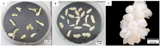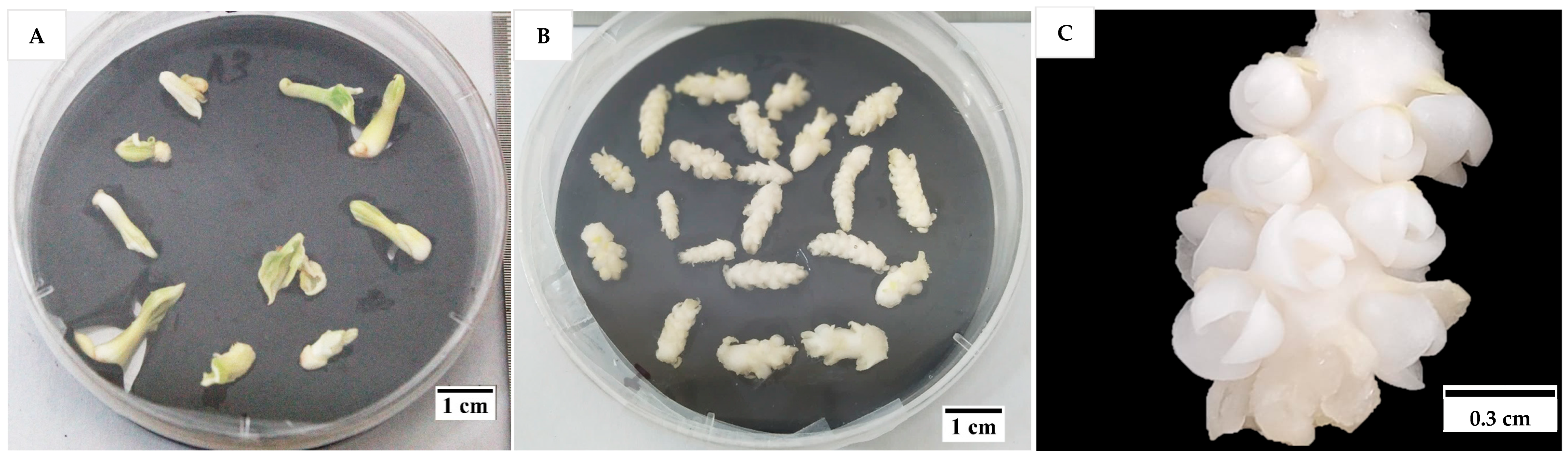 Figure 3). Subsequent experiments used inflorescences as explants due to the initial positive results, because they were somatic tissues that ensure true-to-type plants during micropropagation, and because they were much more numerous than seedling meristems.