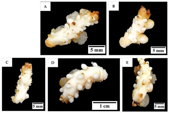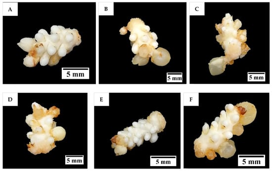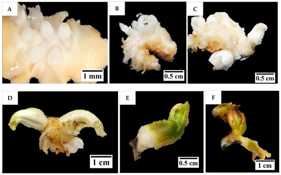 This experiment was conducted at the Coconut Research Centre, The University of Muhammadiyah Purwokerto, Indonesia. The isolated shoot tips from 3-month-old seedlings of NYD and the extracted rachillas at the −3 to −6 stages of development (ca. 3 to 6 months before opening) from two palms of BT were used as the explants in this experiment. Both forms of explants were cultured onto a shoot induction medium (SIM) which consisted of Y3 medium, AC (Sigma, C9157; 2.5 g L−1), sucrose (30 g L−1), Gelzan (Sigma, G1910; 3 g L−1), and various concentrations of BAP (Sigma, B3408; 0, 20, 40, 100, 200, or 400 µM) or TDZ (Sigma, P6186; 0, 20, 40, 100, or 200 µM) in Petri dishes (LabServ®, Auckland, New Zealand; LBS60014X, 90 × 25 mm diameter/height; 42 mL media). A PGR-free Y3 medium was used as the control. All cultures were incubated under a 16/8 h (light/dark) photoperiod at a low white light intensity of 5 µmol m−2 s−1 for four to six weeks. The temperature was maintained at 27 ± 2 °C throughout the culture period. The number of explants that produced at least a single shoot from the shoot tips at week 6, and the number of immature inflorescence explants that survived at week 4, were recorded. The immature inflorescence explants that showed growth enlargement and with no serious browning, were counted as surviving explants.
