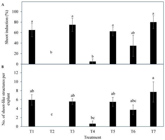 Section 2.2) and at a temperature of 27 ± 1 °C. Then, the shoot induction percentage and the number of shoot-like structures per explant were determined after 16 weeks. The shoot-like structures that formed were selected and further cultured onto a PGR-free Y3 medium contained in 250 mL glass bottles (Austratec Pty. Ltd., Victoria, Australia; C926), supplemented with sucrose (30 g L
