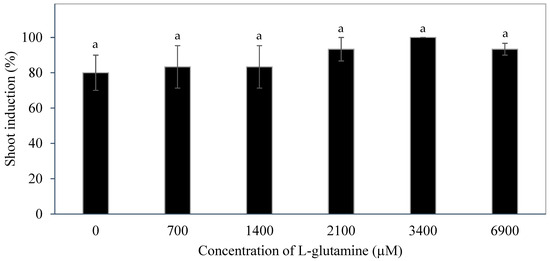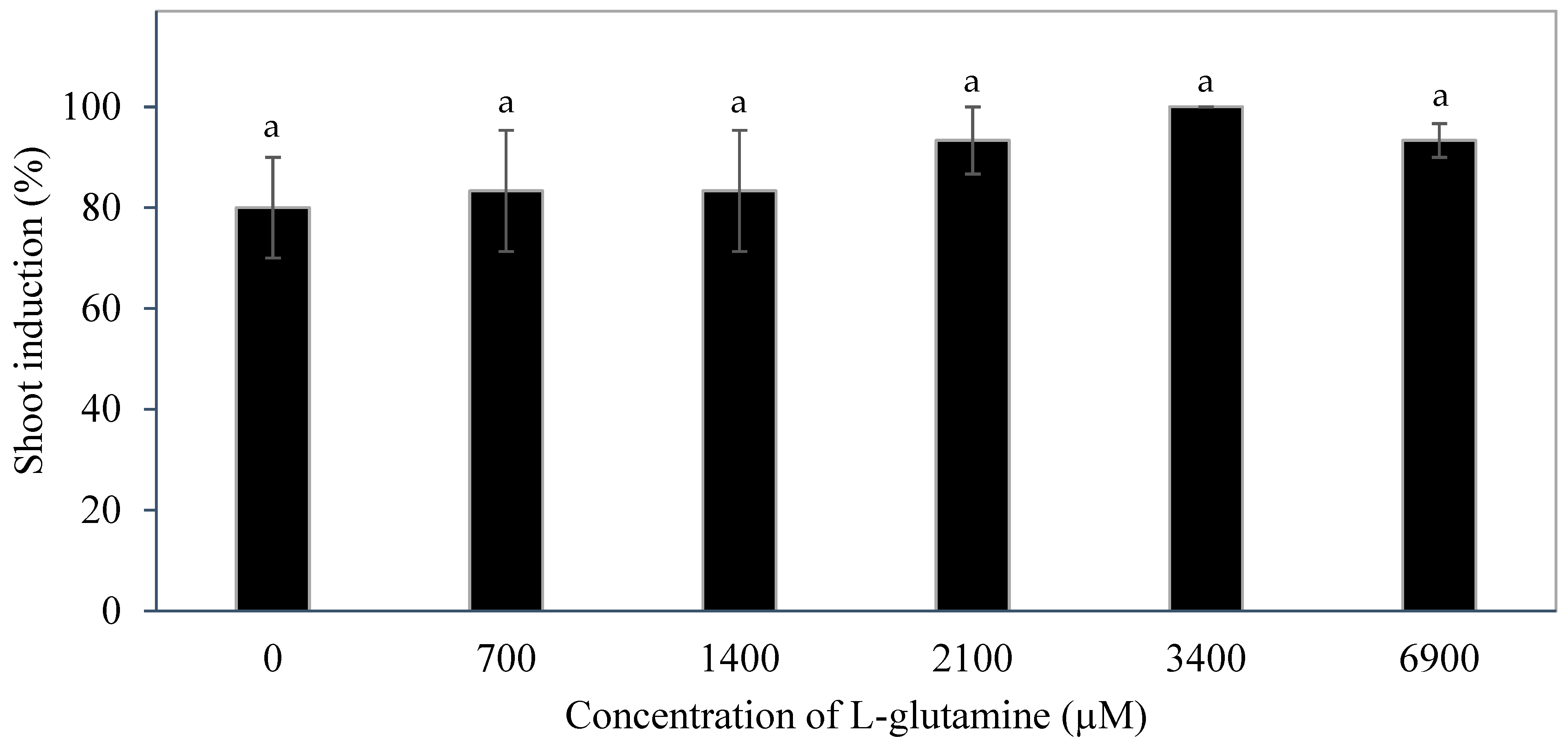 21]. The addition of L-glutamine also produced a higher shoot induction percentage, ca. 83 to 100% (