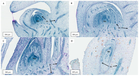 Germinating zygotic embryos from the Indian variety, Sampoorna (at either 0, 2, or 4 weeks after culture), explants with shoot-like structures obtained from CAIRNS inflorescence explants in Experiment 2 (5-month-old), and immature inflorescence explants of AR from Vietnam (at −2, −3, −4, and −5 developmental stages), were selected for histological study. This study on zygotic embryos was used to determine the basic structure and growth pattern of embryo plumules for comparison with the shoot-like structures developed from the CAIRNS variety. The study on the different developmental stages of immature inflorescence explants was conducted to determine a suitable explant age for immature inflorescence organogenesis for Experiments 3 to 5.