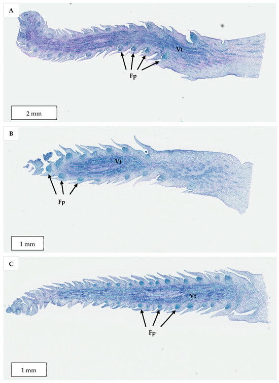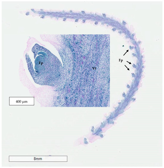 v)] before being covered twice with xylene for 10 min in a vacuum chamber (0.4 MPa) at room temperature. They were then placed onto a stirrer for 50 min at standard room temperature and pressure. The xylene-treated embryos were then covered with liquid paraffin wax and placed into the vacuum chamber (0.4 MPa) for 1 h at 65 °C and this treatment was repeated. Then, the samples were covered with fresh paraffin wax and placed in the vacuum chamber (0.4 MPa) for three days at 65 °C before being mounted on an embedding station (Medite, TES Valida; Thermo Scientific, Microm EC 350-2). The wax-covered samples were sectioned into 6 µm sections using a rotary microtome (Leica Biosystems, Nussloch, Germany; RM2245) and collected on microscope slides maintained in a water bath (40 °C). The slides were placed in the oven (38 °C) overnight to remove moisture before performing the staining procedure. The staining steps from dewaxed samples in xylene until staining with 1% periodic acid were the same as previously described [
