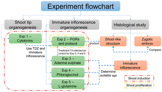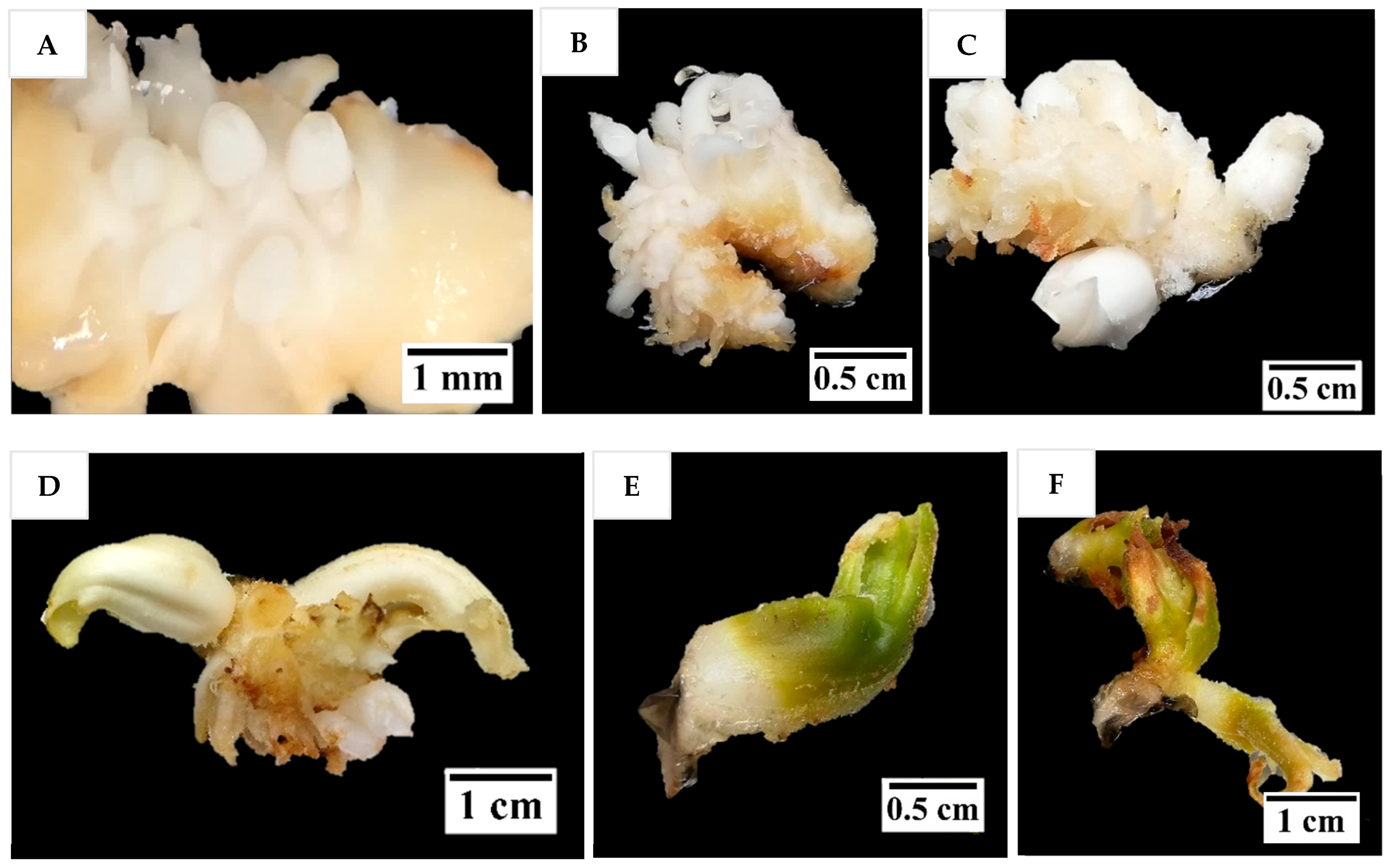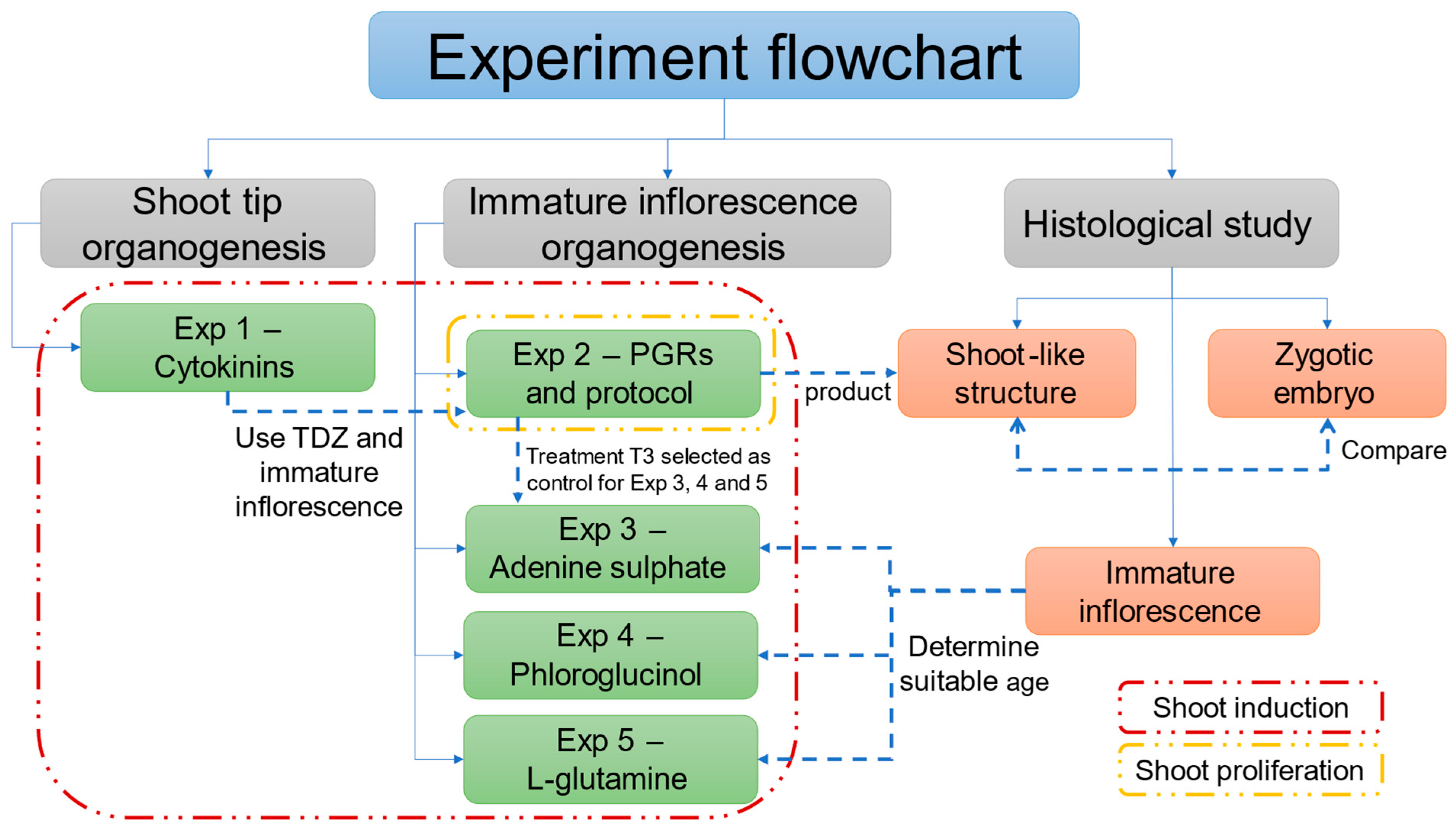 Figure 1). Shoot tip was used in the first experiment, but inflorescence explants were used in subsequent experiments because they were immediately available in large quantities and has a lower risk of somaclonal variation. The study also investigated protocols (of different PGRs combination) suitable for inducing and proliferating shoots and aimed to improve direct shoot induction using media additives including adenine sulphate, phloroglucinol, and L-glutamine. Importantly, a histological analysis was undertaken to better understand the anatomical differences in the shoot meristems obtained from zygotic embryos and those of the shoot-like structures developed during organogenesis.