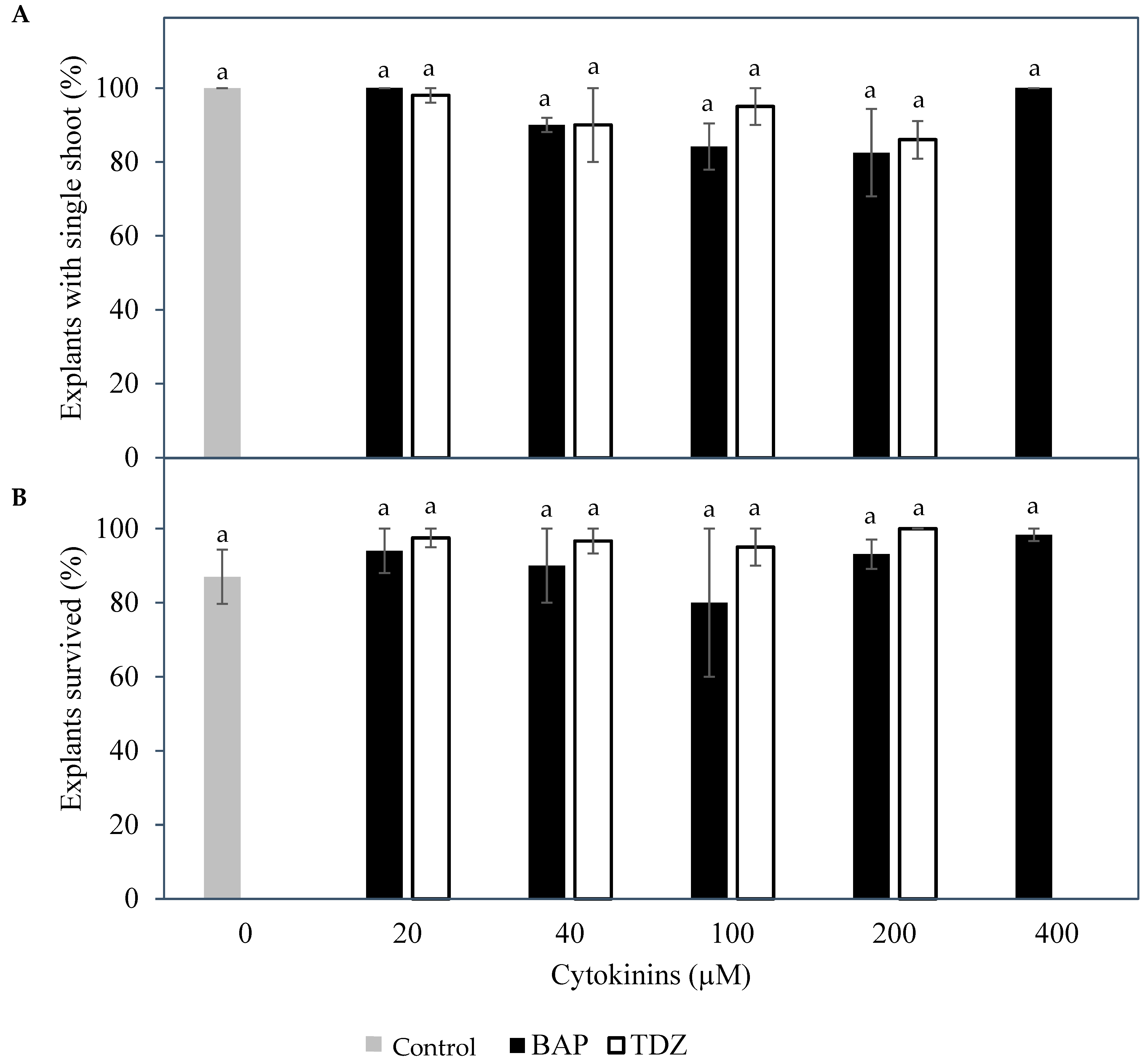 10]. Therefore, the effect of various concentrations of BAP and TDZ on the formation of shoots from meristem and immature inflorescence explants was determined in this study. For shoot tip explants, it was found that only a single shoot (