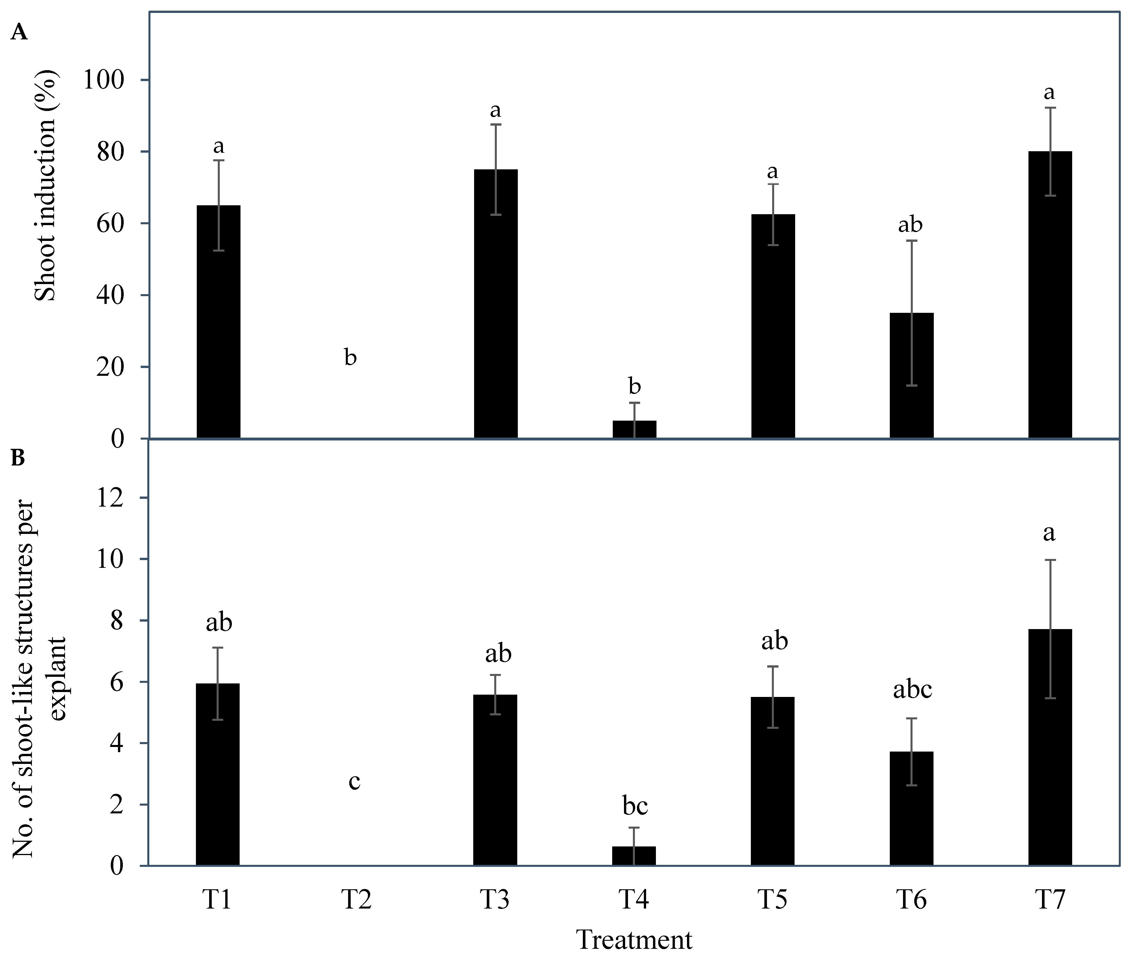 The shoot induction percentage was based on four replicates per treatment (T) with 10 explants in each replicate. Each rachilla section represented one explant. Documenting the number of shoot-like structures per explants was based on the number of explants with shoots induced only, so there were four replicates per treatment with an average of four to eight explants per replicate. The experimental design was a completely randomized design (CRD) and all data collected were analyzed using a one-way ANOVA.