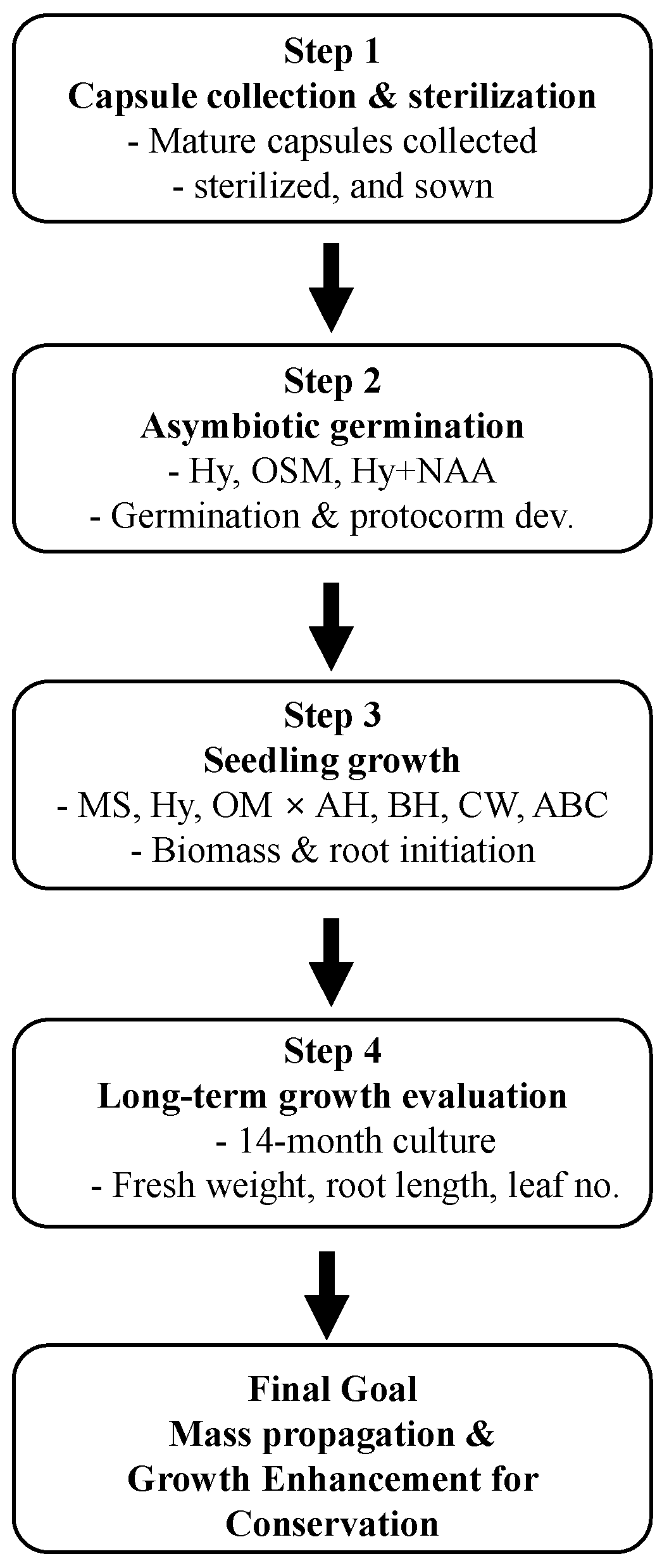 Hwang, J.E.; Park, H.B.; Tho, J.-H.; Kim, M.; Park, H.J.; Kim, S.; Lee, C.W.; Kim, Y.-J. Influence of Basal Medium and Organic Additives on In Vitro Germination and Plant Growth of Endangered Orchid Gastrochilus fuscopunctatus. Plants 2025, 14, 3133. https://doi.org/10.3390/plants14203133