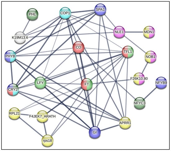 A protein–protein interaction (PPI) network using STRING-based bioinformatic data with a 0.90 confidence level was constructed using information garnered from the A. thaliana genome (Figure 2). This exercise yielded a protein–protein interaction circuitry that was utilized to guide the selection of genes to be quantitatively analyzed during the early flowering process observed in in vitro Ah plants grown under R-BLL in long-day photoperiod conditions. This experimental strategy was implemented with the aim of identifying a possible signaling pathway able to explain the role of R-BLL light in the induction of the uncharacteristic long-day flowering trait observed in short-day flowering Ah plants.