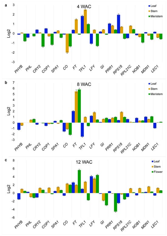 The R-BLL-to-WLL relative expression value ratios obtained during the different development periods are shown in Figure 3. In the first 4 weeks (Figure 3a), TOC/PRR1, TFL1, and RPS18 were among the genes most highly induced in the leaves and stem, whereas the former two were among the only genes expressed in the meristems. This showed a prevalence of factors that sustained the repression of flower development in the meristems at 4 WAC. Subsequently, in week 8 (Figure 3b), the FT gene, coding for the master regulator of flowering that promotes the transition from vegetative to reproductive development in plants [], increased to unexpectedly high expression levels under R-BLL, particularly in the meristems. Other genes that reverted to positive R-BLL to WLL relative expression ratios in the SAM/FM at 8 WAC were SPA1, LFY, GI, RSP18, NOB1, MDN1, LEC1, and PHL, while others such as RPL21C and, importantly, the TFL1 flowering-repression gene, showed reduced or negative expression ratios. This expression pattern was already indicative of a molecular organization positively orientated toward the induction of flowering and seed production, considering, for example, the roles of SPA1, PHL, NOB1, MDL1, and LEC1 in the control of photoperiodic flowering and the circadian clock, the promotion of flowering under red light, and seed, embryo, gametophyte, and pollen development, respectively [,,]. Lastly, at 12 WAC (Figure 3c), the most telling changes in gene expression observed in flowers were the induction of CO, the central controller of the photoperiod-sensing mechanism in plants that determines flowering by regulating FT, and of the PHYB and CRY2 photoreceptor genes. These could have possibly permitted the integration of upstream FT-activating signals transmitted by COP1 []. The R-BLL-to-WLL relative expression value ratios of LFY in flowers also markedly increased.