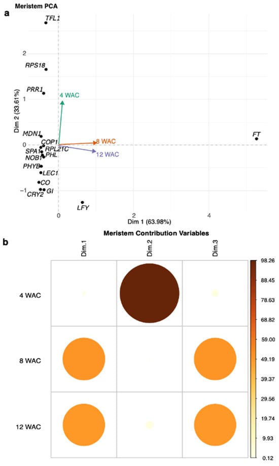 Principal component analysis (PCA) of the quantitative gene expression assays detected in apical meristems and flowers. In (a) the PCA1 (x-axis, increasing average expression) indicates that 63.98% of the genes analyzed had significantly modified levels of expression. Here, the FT gene exhibited the higher gene contribution in gene expression (i.e., 90.41), making it, by far, the most relevant gene in flowering development under R-BLL conditions 12 WAC. PCA2 (y-axis, increasing positive trend) explained 33.61% of the variance. It indicated that the most relevant contribution to this component during flowering at 12 WAC was from TFL1 (44.46). It was followed by RPL18 (17.00), LFY (9.8), and PRR1 (7.97). (b) Components 1 and 3 were enriched in genes whose maximum levels were reached at 8 and 12 WAC, while component 2 grouped those genes whose expression was predominant at 4 WAC, representing the pre-flowering vegetative stage.
