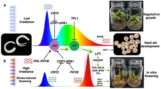 Induced flowering in in vitro-cultured A. hypochondriacus plantlets maintained under red–blue LED lights in the context of a non-flowering-inducing long-day photoperiod: proposed model based on homology with A. thaliana. Two hypothetical scenarios are shown: (a) half-zygotic embryos cultivated during long-day photoperiods under white LED light (WLL) luminaries with low irradiance; the CRY2 blue light receptor becomes the dominant regulator. This triggers the day-time repression of CO that contributes to blocking the formation of the SPA1-COP1 complex. Furthermore, under these conditions, the TFL-mediated repression of flowering via FT is favored. (b) In vitro cultivation maintained under 3:1 red–blue (R-B) LED luminaries with high irradiance activates a different flower-inducing process that involves the formation of a PHL-PHYB complex that favors the activation of CO; this step is further promoted by the inhibited formation of the SPA1-COP1 complex by the PHYB red light receptor and CRY2. The sum of these events promotes the activation of FT, which leads to the downstream accumulation of LFY that allows the chromatin opening of the SWI/SNF complex and the binding of transcription factors (TFs) that stimulate flower development. At the same time, ribosomal biogenesis via RPS18 and other proteins aids in the formation of in vitro flowers capable of generating fertile seeds via LEC1.