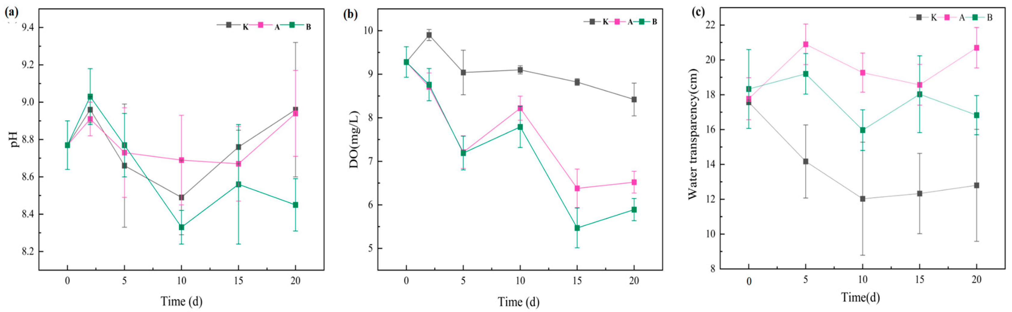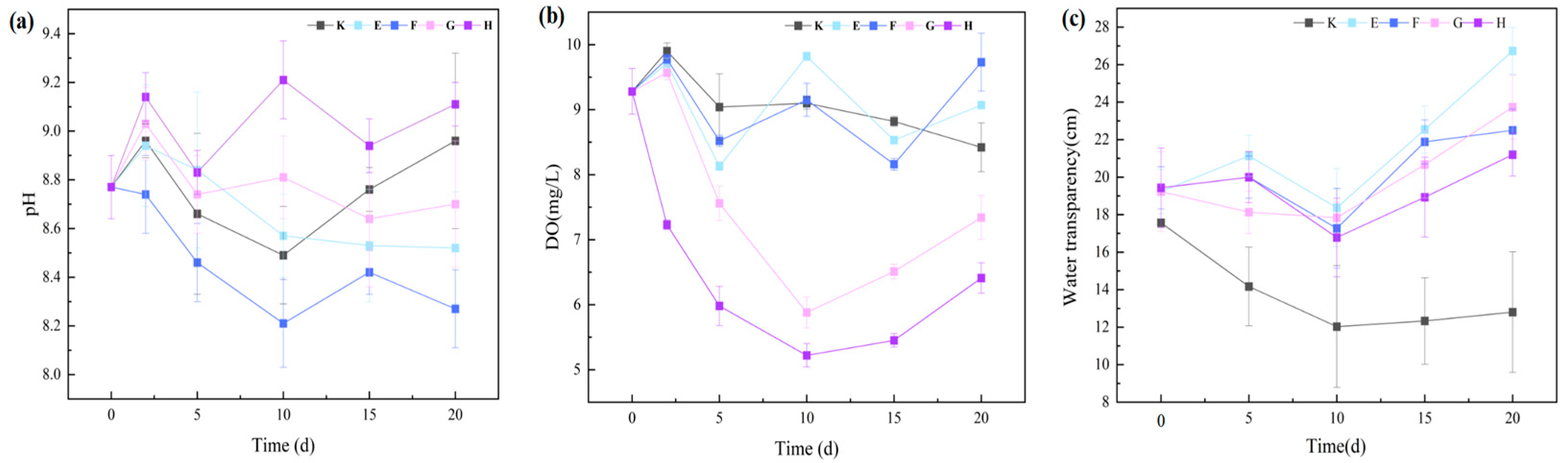 3.3.1. Variations in pH, Dissolved Oxygen (DO), and Water Transparency