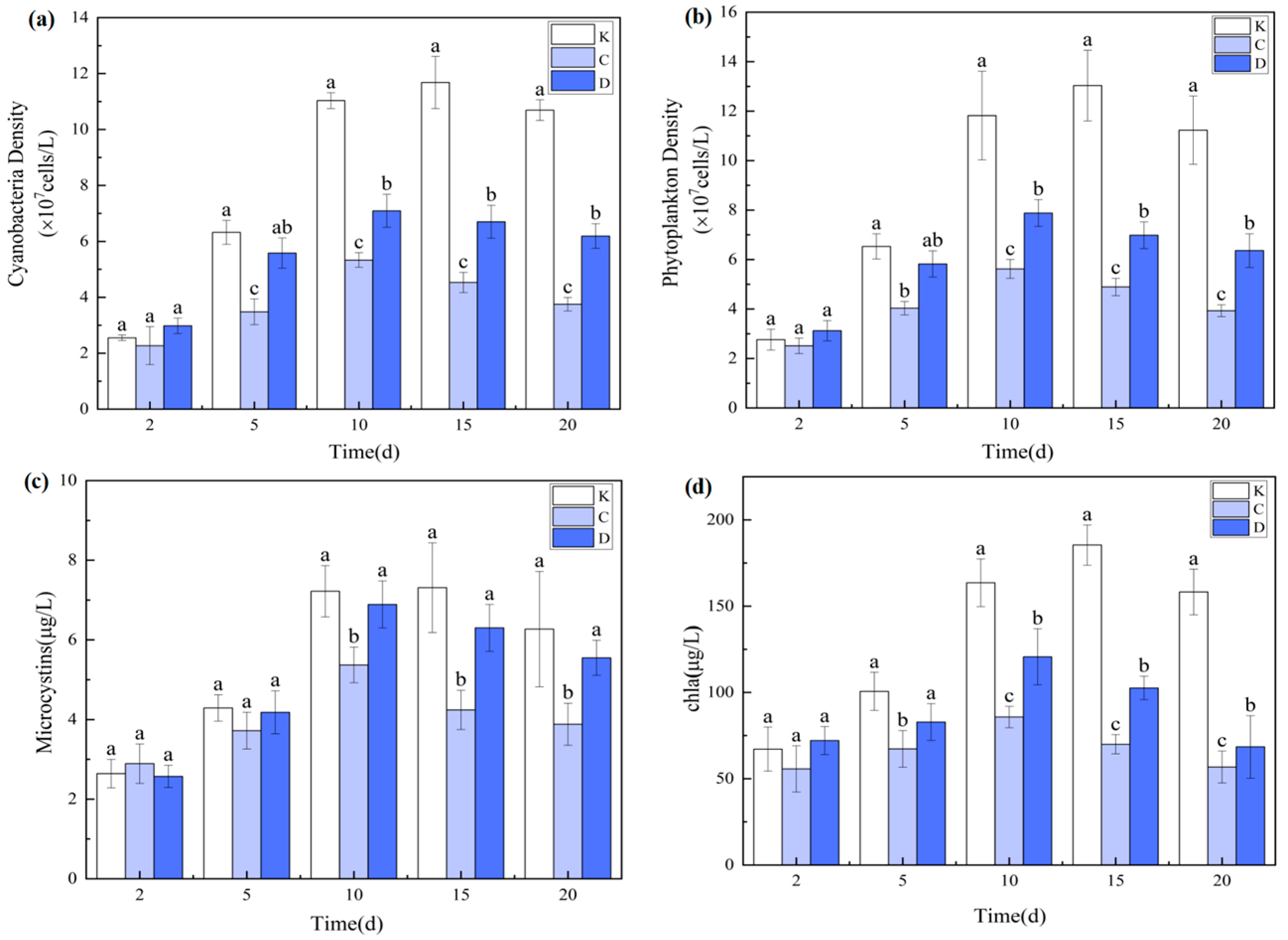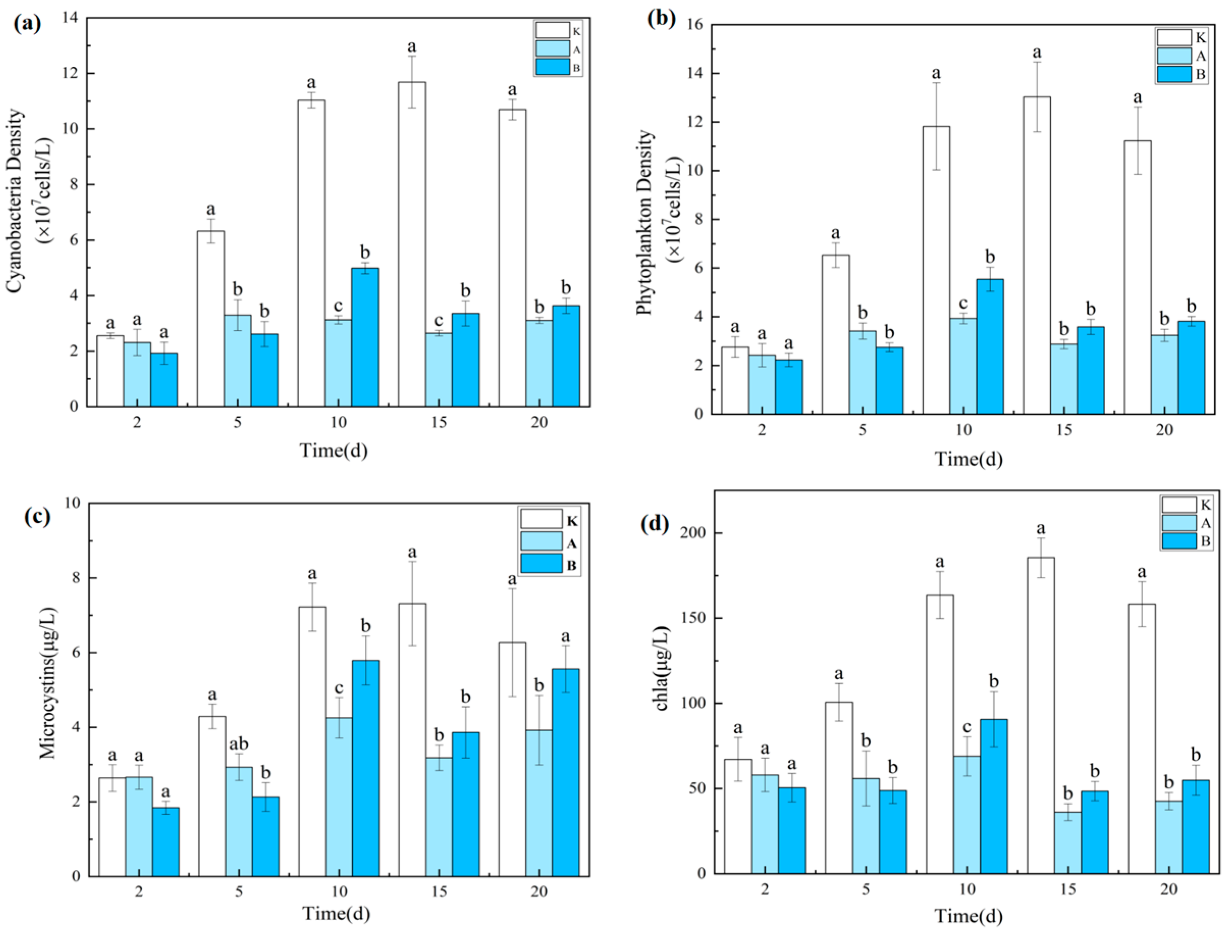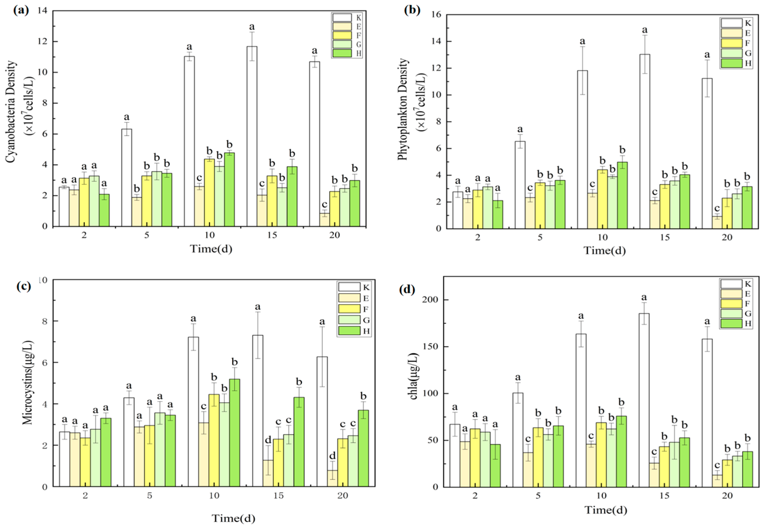 3.3.3. Synergistic Suppression of Phytoplankton and Microcystins