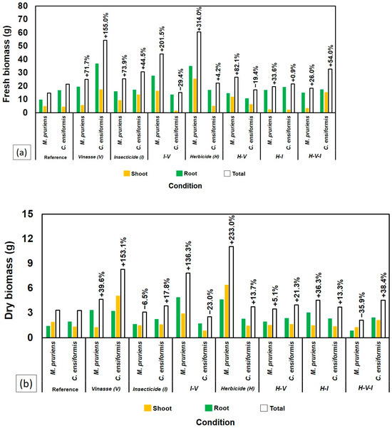 - Frias, Y.A.; Lima, E.W.; Aragão, M.B.; Nantes, L.S.; Moreira, B.R.A.; Cruz, V.H.; Tomaz, R.S.; Lopes, P.R.M. Mucuna pruriens cannot develop phytoremediation of tebuthiuron in agricultural soil with vinasse: A morphometrical and ecotoxicological analysis. Front. Bioeng. Biotechnol. 2023, 11, 1156751. [Google Scholar] [CrossRef]
