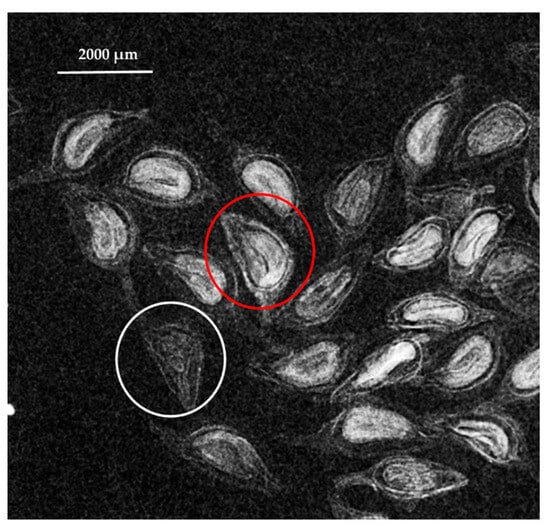 Seeds of S. platyphylla under X-ray examination (Faxitron MX-20), with the seed circled in red identified as filled and the seed circled in white considered to be unfilled.