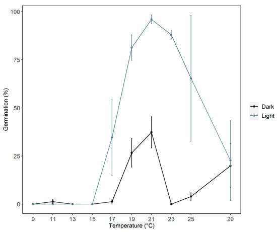 A significant interaction was observed between incubation temperature and light conditions (Generalized Linear Model, GLM binomial, p < 0.0001, Figure 2). Germination predominantly occurred at warmer temperatures (17 to 29 °C) under both light and dark conditions, but with significantly higher germination rates under light (GLM binomial, p < 0.0001) (Figure 2). The average percentage germination achieved under both illumination conditions ranged from ca. 37 (dark) to 96% (light). Under light conditions, germination remained low at temperatures below 17 °C and then increased sharply, peaking at 21 °C with ca. 96 ± 2% (GLM binomial, p < 0.0001). Beyond 21 °C, germination declined. Under constant dark conditions, germination was low, below 17 °C, increased steadily between 17 °C and 21 °C (reaching 37 ± 8%), dropped to near zero at 23 °C, and then slightly increased again toward 29 °C (20 ± 11%). The results of a Type II analysis of deviance (ANOVA) are summarized in Table 1.