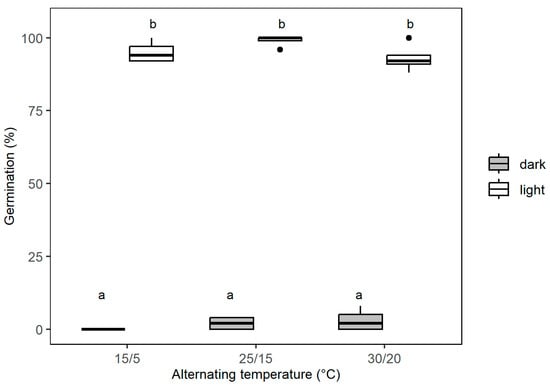 Effect of three different diurnal temperature regimes on germination of S. platyphylla seed under a 12/12 h (light/dark) photoperiod of white light and darkness after 28 days. The box plots span the 25th and 75th quartiles, the band in the box is the median, and the whiskers indicate the data range. Outliers are denoted as dots. Letters indicate the significant difference between the treatment means at p < 0.05 (TukeyHSD).