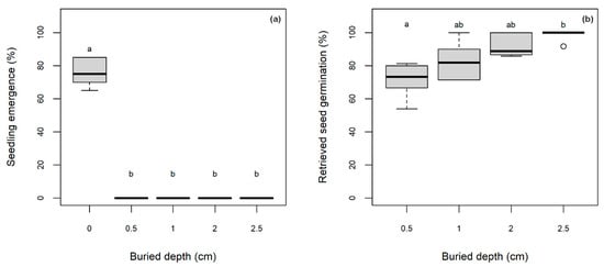 Effects of five different burial depths (0.0 to 2.5 cm) on S. platyphylla seedling emergence (a) and germination of retrieved seeds (b). In panel (b), all seeds from the substrate surface (non-buried treatment, 0 cm) had fully decomposed and could not be recovered. The box plots span the 25th and 75th quartiles, the band in the box is the median, and the whiskers indicate the data range. Outliers are denoted as dots. Letters indicate the significant difference between the treatment means at p < 0.05 (TukeyHSD).
