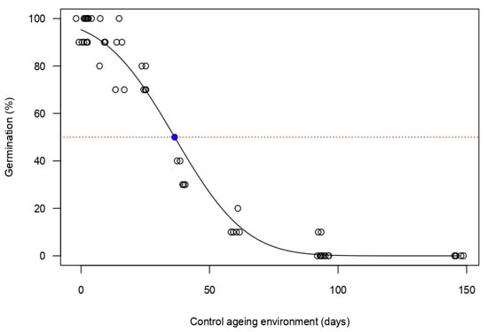 The response of a S. platyphylla seed lot under a controlled aging test run at 45 °C and 60% relative humidity. Upon sample retrieval from the test, the germinability was determined by incubation at 25/15 °C with a matching 12/12 h (light/dark) photoperiod. The blue dot indicates the predicted time when germination had fallen to 50% (P50). The red horizontal dashed line marks the 50% germination threshold. The open circles are the mean germination percentages of five replicate lots of 10 seeds, and overlapping germination values were slightly shifted to ensure all data points are visible.
