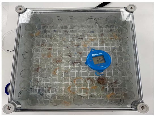Prior to the CAT experiment, the second seed lot was tested for germination under optimal conditions (25/15 °C, 12/12 h light/dark photoperiod) as identified in Experiment 1 with four replicates of 25 seeds per replicate. The CAT was conducted in the seed laboratory at UQ, Gatton Campus. Prior to transferring the seeds to the CAT-controlled environment, a rehydration step was applied to minimize damage caused by sudden rehydration []. To pre-equilibrate the seeds, 12 replicates of 50 freshly harvested seeds (ca. 10 days-old) were placed in open-top glass vials (25 mL) and exposed to a lithium chloride (LiCl) solution (370 g L−1 H2O), maintaining a RH of 47 ± 1% inside a sealable chamber, incubated at 20 ± 1 °C. The sealable chamber had a plastic grid stand inside to keep the glass vials with seeds above the LiCl solution (Figure 6). After 14 days of seed rehydration, all 12 glass vials containing seeds were transferred into a second identical sealable chamber containing a LiCl solution (300 g L−1 H2O), producing a 60 ± 2% RH. The box was then placed into a laboratory oven set at 45.0 ± 0.5 °C to undergo the CAT under darkness. As the RH produced by the LiCl solution inside the box is known to decrease with time, distilled water was added weekly to readjust the RH back to 60% [,]. Glass vials were removed periodically (at 0, 1, 3, 8, 15, 24, 39, 60, 92, 95, 120, and 147 days after treatment), and their seeds were assessed for viability using a germination test. The germination test was conducted under optimal temperature and light conditions, as identified in Experiment 1, with five replications of 10 seeds per replicate, taken at random from each glass vial.