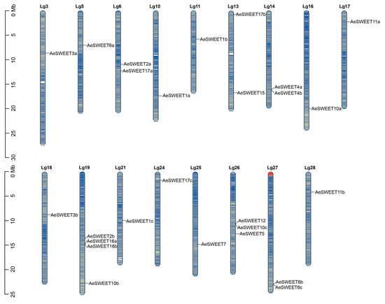 Distribution of AeSWEETs on the whole-genome chromosomes. The scale represented chromosome length, with the black lines denoting the loci of individual AeSWEET genes. Chromosome coloration reflected gene density, where blue denoted high gene density and yellow signified low gene density.