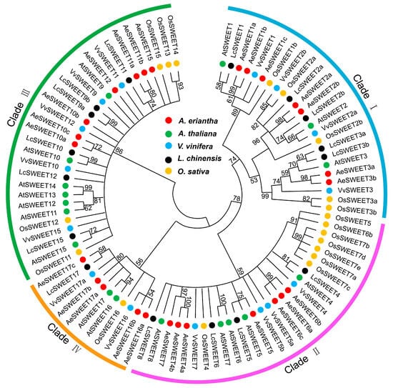 Subsequently, an interspecific phylogenetic tree was constructed using the aligned dataset of both dicot and monocot SWEET sequences to assess evolutionary relationships. All SWEET proteins were grouped into four major clades: Clade I, II, III and IV (Figure 2). The AeSWEET proteins were distributed across all clades. Specifically, seven AeSWEETs clustered with plant SWEET1, 2, and 3 in Clade I; another seven were associated with SWEET4, 5, 6, and 7 in Clade II; seven more grouped with SWEET9 to 15 in Clade III; and five aligned with SWEET16 and 17 in Clade IV. Notably, most AeSWEETs within each clade exhibited species-specific clustering, such as AeSWEET1a and 1b in Clade I, AeSWEET6a, 6b and 6c in Clade II, AeSWEET11a and 11b in Clade III, and AeSWEET16a and 16b in Clade IV. Pairwise comparisons of both ORF and protein sequences demonstrated higher sequence identity among AeSWEET genes within the same species-specific clade (Table S2). These findings suggested that the expansion of the AeSWEET family largely occurred after the divergence of kiwifruit and other plant species.