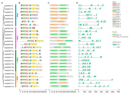 Intraspecific evolutionary tree, conserved motif, functional domain, and gene structure of AeSWEETs. (A) The phylogenetic tree of 26 AeSWEETs. (B) The distribution of conserved motifs among AeSWEETs. (C) The conserved domains of AeSWEETs. (D) The exon-intron organization of AeSWEETs, where a value of 0 indicated that intron insertion did not disrupt the codon, 1 signified intron insertion following the first base of the codon, and 2 denoted intron insertion after the second base of the codon.