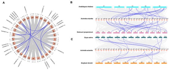 Collinearity analysis of the AeSWEET family genes. (A) Collinear gene pairs of AeSWEET family genes. (B) Collinear gene pairs of SWEETs across Actinidia erientha, Arabidopsis thaliana, and Solanum lycopersicum. (C) Collinear gene pairs of SWEETs among Actinidia erientha, Oryza sativa, and Sorghum bicolor. Gray lines were used to connect the collinear gene blocks, while blue lines were utilized to link collinear SWEET gene pairs.