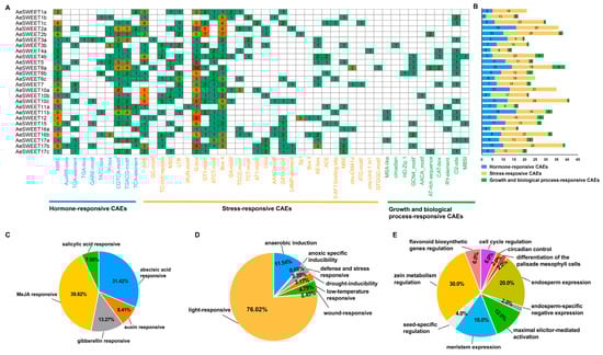 Cis-acting elements (CAEs) in the AeSWEET promoters. (A) Categorization of cis-acting elements in AeSWEET promoters. Green in the heatmap indicated lower values, while red indicated higher values. (B) The counts of cis-acting elements within each promoter from the three distinct groups. (C) Percentage of cis-acting elements associated with hormone-response. (D) Percentage of cis-acting elements associated with stress-response. (E) Percentage of cis-acting elements associated with growth and biological processes.