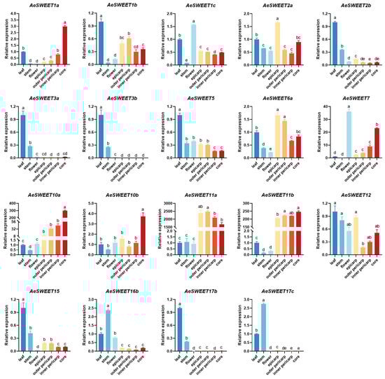 Relative expression of the AeSWEET family genes in different tissues. The expression level in the leaf was normalized to 1. Differences in gene expression were assessed by one-way ANOVA with Tukey’s Honestly Significant Difference test, using distinct letters to denote statistical significance (p < 0.05).