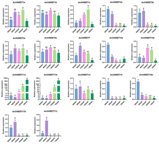 Relative expression of the AeSWEET family genes throughout fruit development and ripening. The expression level at 60 days after full bloom was normalized to 1. Differences in gene expression were assessed by one-way ANOVA with Tukey’s Honestly Significant Difference test, using distinct letters to denote statistical significance (p < 0.05). DAF indicated days after full bloom, while DAH referred to days after harvest.