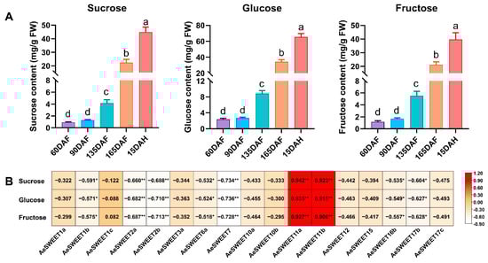 Analysis of sugar contents and their correlation with AeSWEET genes during fruit development and ripening. (A) The concentrations of sucrose, glucose and fructose during fruit development and ripening. DAF indicated days after full bloom, while DAH referred to days after harvest. Differences in sugar concentrations were assessed by one-way ANOVA with Tukey’s Honestly Significant Difference test, using distinct letters to denote statistical significance (p < 0.05). (B) Correlation of sugar contents and expression levels of AeSWEET genes during fruit development and ripening. Asterisks indicated statistical significance (* p < 0.05, ** p < 0.01).