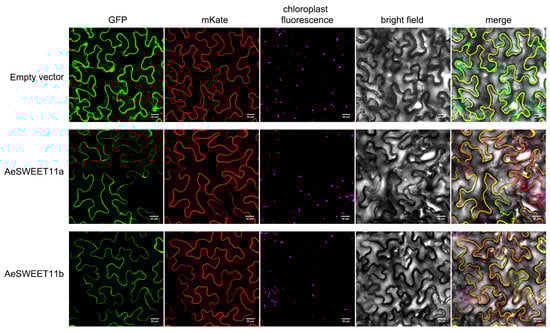 Plant structural genes typically function within distinct subcellular compartments. To validate the presumed subcellular localization, the epidermal cells of Nicotiana benthamiana leaves were co-transformed with either 35S:AeSWEET11a-GFP or 35S:AeSWEET11b-GFP and a plasma membrane marker protein labeled with mKate (35S:AtNAA60-mKate) []. The control protein (35S:GFP) showed green fluorescence signal distributed throughout the entire cell, including membranes, cytoplasm, and nuclei. In contrast, the green fluorescence signal of 35S:AeSWEET11a-GFP or 35S:AeSWEET11b-GFP was exclusively observed in the membranes, coinciding with the red fluorescence signal of 35S:AtNAA60-mKate (Figure 9).