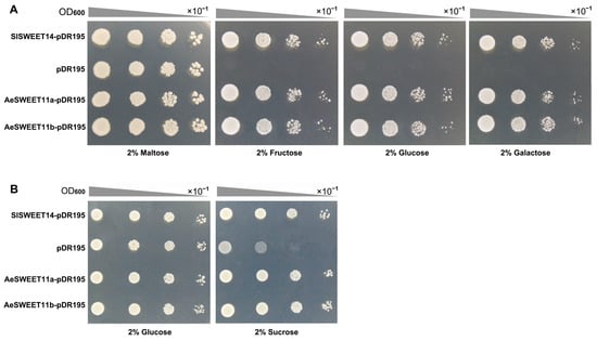 The functionality of the two AeSWEET11 genes in sugar transport was tested via heterologous expression in two yeast mutant strains, EBY.VW4000 [] and SUSY7/ura3 []. EBY.VW4000 is a hexose transport-deficient strain incapable of utilizing monosaccharides for growth but can thrive on maltose. In contrast, the SUSY7/ura3 strain lacks extracellular invertase, which prevents it from using sucrose as the sole carbon source, although it possesses sucrose synthase activity and thus can metabolize sucrose via the exogenous sucrose transporter. Spotting assays showed that EBY.VW4000 cells transformed with AeSWEET11a-pDR195, AeSWEET11b-pDR195, or SlSWEET14-pDR195 (the positive control) exhibited robust growth on SD/-Ura medium supplemented with 2% (w/v) maltose or three monosaccharides (fructose, glucose, and galactose; Figure 10A). Conversely, EBY.VW4000 cells transformed with the empty pDR195 vector (the negative control) only grew on maltose and failed to grow on media containing fructose, glucose, or galactose. Furthermore, SUSY7/ura3 strains transformed with AeSWEET11a-pDR195, AeSWEET11b-pDR195, or SlSWEET14-pDR195 exhibited obviously faster growth on sucrose-containing media than those harboring the empty pDR195 vector (Figure 10B). These results suggested that both AeSWEET11a and AeSWEET11b functioned as transporters for hexoses (fructose, glucose, and galactose) and sucrose.