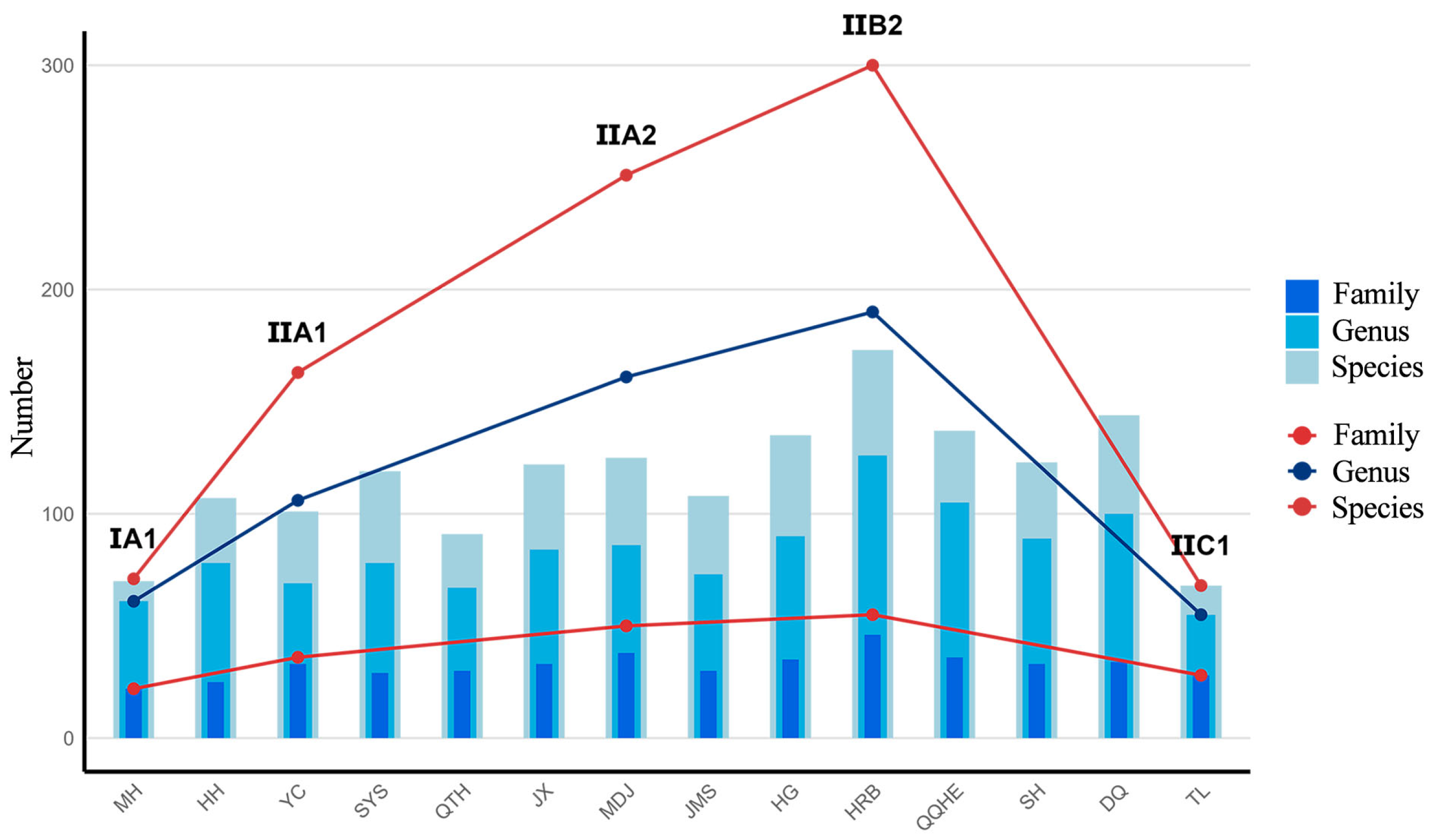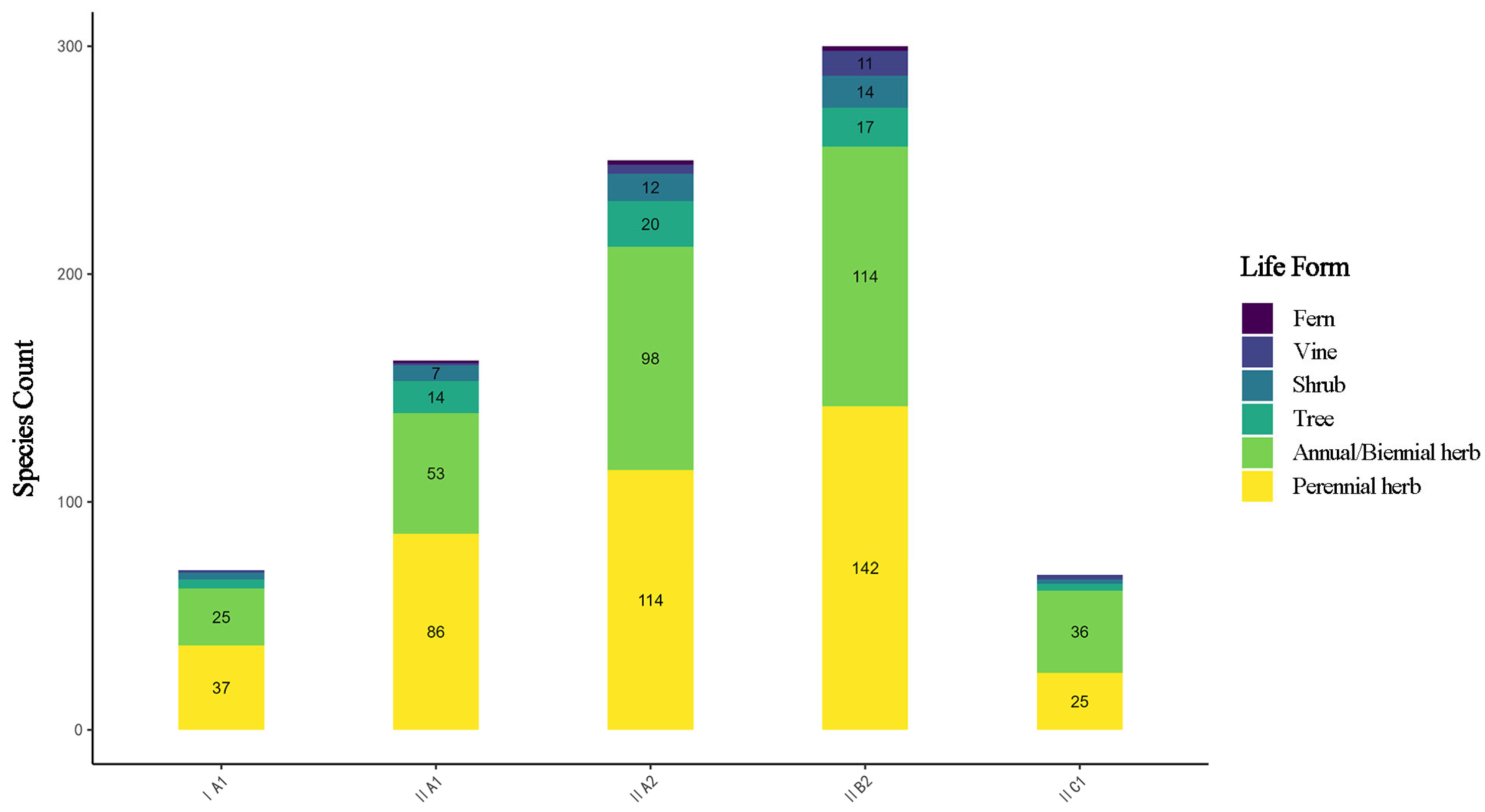 - Subzones II A2 and II B2: Both are situated in mid-temperate zones and host larger cities in Heilongjiang Province. Subzone II A2 has high species diversity and relatively balanced life form distribution. It is recommended to delineate ecological conservation redlines, establish multi-layered vegetation structures (tree-shrub-herb) [56,57], strengthen natural maintenance capacity of communities, and prevent habitat fragmentation. Subzone IIB2 has the richest species diversity but the greatest internal community variability and faces significant invasion pressure. The strategy should focus on “connectivity and prevention,” controlling urban warming, curbing the spread of non-native species, and implementing quarterly invasive species coverage surveys [25,36,58].