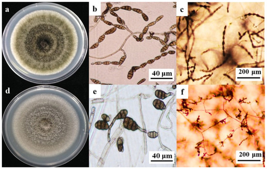 The morphological characterization of 57 A. alternata isolates revealed initial colony pigmentation transitioning from tan to dark brown on potato dextrose agar (PDA). The pathogen exhibited filamentous conidial chains containing 8–12 conidia per linear arrangement. Conidiophores measured (10.3 μm–48.1 μm (length)) × (4.9 μm–13.4 μm (width)), terminating in phialides that produced ovoid to ellipsoidal conidia ((15.9–31.2) μm × (5.5–12.2) μm). Conidial structures displayed 1–5 transverse septa and 0–2 longitudinal septa, with intercalary cells embedded within septate conidia (Figure 1d–f). These phenotypic traits, including colony morphology, conidial dimensions, and septation patterns, were morphologically congruent with A. tenuissima and A. alternata reference strains as documented by Simmons [27].