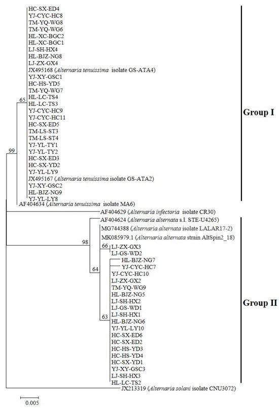 Phylogenetic reconstruction of histone H3 gene sequences (546 bp) resolved 48 Alternaria pathogenic strains into two major clades. Bootstrap support (1000 replicates) and Bayesian posterior probabilities (2M generations) demonstrated (1) Group I (A. tenuissima) with ≥99% support and (2) Group II (A. alternata) with ≥98% support. Outgroup taxa (A. solani isolate CNU3072 (JX213319) and A. infectoria isolate CR30 (AF404634)) were chosen to root the tree at the Alternaria crown group.