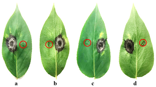 Pathogenicity of 48 Alternaria isolates on detached and healthy Yanbian Pingguoli pear leaves (6 cm long and 3.5 cm wide) naturally grown in Pingguoli pear orchards at the end of May. (a): Adaxial side of the leaf inoculated with A. tenuissima. (b): Abaxial side of the leaf inoculated with A. tenuissima; (c): Adaxial side of the leaf inoculated with A. alternata. (d): Abaxial side of the leaf inoculated with A. alternata.