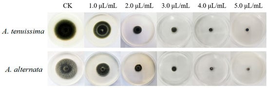 Antifungal inhibitory effects of AcEO on mycelial growth of A. tenuissima YJ-XY-GSC1 and A. alternata YJ-XY-GSC3 in PDA medium supplemented with gradient concentrations of AcEO (0, 1.0, 2.0, 3.0, 4.0, and 5.0 μL/mL).