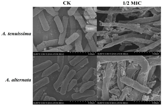 SEM pictures of A. tenuissima YJ-XY-GSC1 and A. alternata YJ-XY-GSC3 treated with varying AcEO concentrations (0 and 1/2MIC).
