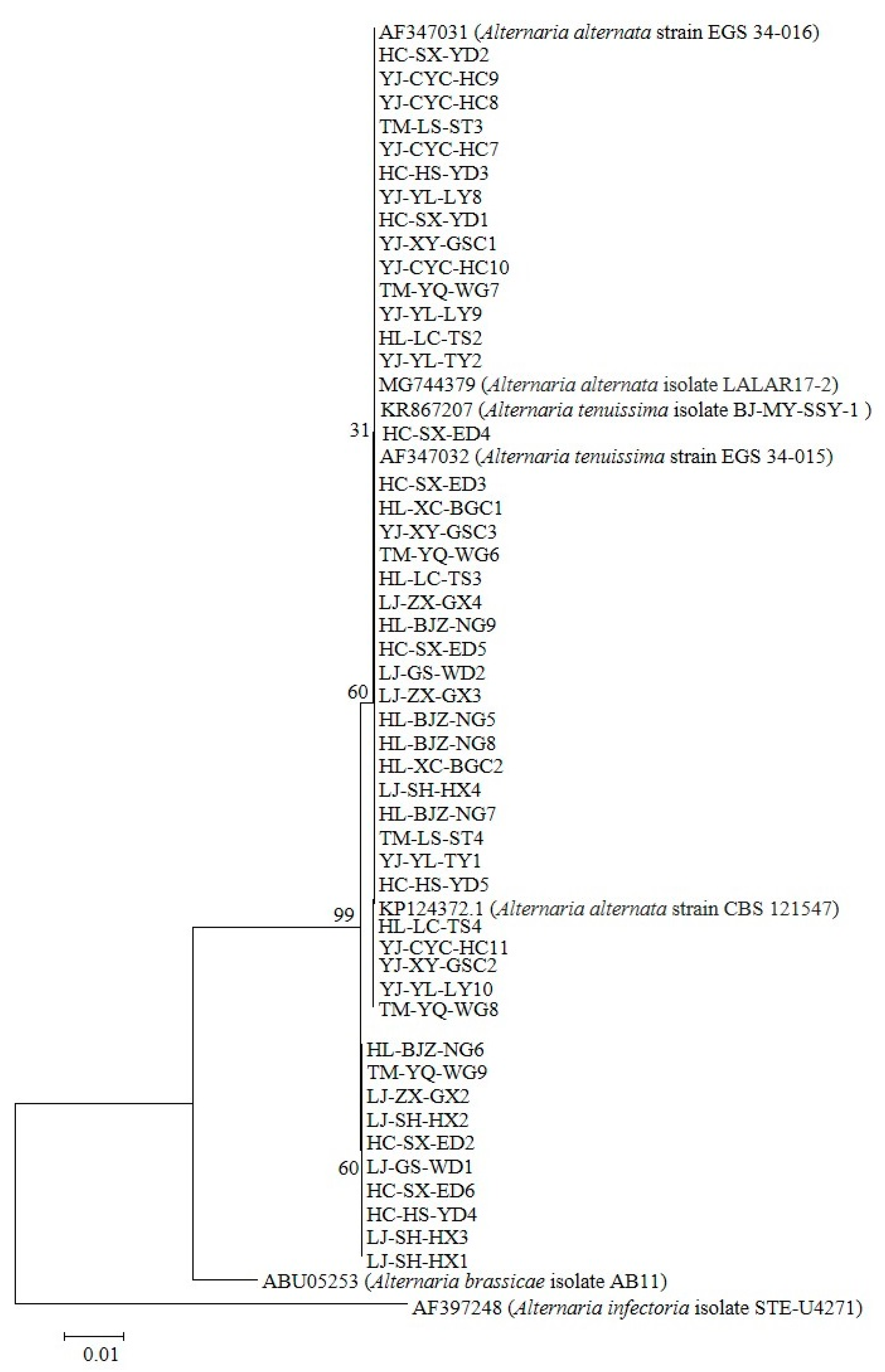 Purified isolates were used to extract DNA following the Two-liquid Plant DNA extraction Kit’s protocol (O' BioLab, Beijing, China). PCR amplification targeted the rDNA-ITS fragments with the primer pair ITS1 (5′-TCC GTA GGT GAA CCT GCG G-3′) and ITS4 (5′-TCC TCC GCT TAT TGA TAT GC-3′). The cycling protocol included an initial melting step (94 °C, 5 min), followed by 35 cycles of 94 °C for 40 s (melting), 58 °C for 40 s (annealing), and 72 °C for 1 min (elongation), concluding with a final extension at 72 °C for 10 min. This protocol was optimized to ensure the efficient amplification of conserved regions across diverse fungal taxa [41]. PCR amplification targeted the histone H3 coding region with the primer pair H3-1a (5′-ACT AAG AG ACC GCC CGC AGG-3′) and H3-1b (5′-GCG GGC GAG CTG G1 GTC CTT-3′). The cycling protocol included an initial melting step (96 °C, 2 min), followed by 30 cycles of 96 °C for 15 s (melting), 55 °C for 30 s (annealing), and 75 °C for 35 s (elongation), concluding with a final extension at 72 °C for 2 min. This protocol was designed to maximize yield while minimizing nonspecific amplification artifacts [42]. Sequencing services for the PCR products were conducted through Beijing Tianyi Huiyuan Biotechnology Co., Ltd. Raw sequence data were processed using the DNAMAN bioinformatics software (Version 5.0) to generate consensus sequences, which were subsequently compared against the non-redundant nucleotide database (nt) via the BLASTn algorithm to retrieve homologous sequences from the NCBI library. Maximum likelihood (ML) analysis of concatenated nucleotide datasets from ITS and histone H3 loci was performed to infer phylogenetic relationships among 124 Alternaria strains using Clustal_W v1.83 [43] (for multiple sequence alignment) and the MEGA 5 software (release 5.2.2; accessible at http://www.megasoftware.net/) (for tree construction). For the haplotype comparison, phylogenetic analysis of concatenated ITS and histone H3 sequences demonstrated bootstrap support values (1000 replicates) for internal nodes. A. brassicae isolate AB11, A. infectoria isolate STE-U4271, A. solani isolate CNU3072, and A. infectoria isolate CR30 were used as outgroups.