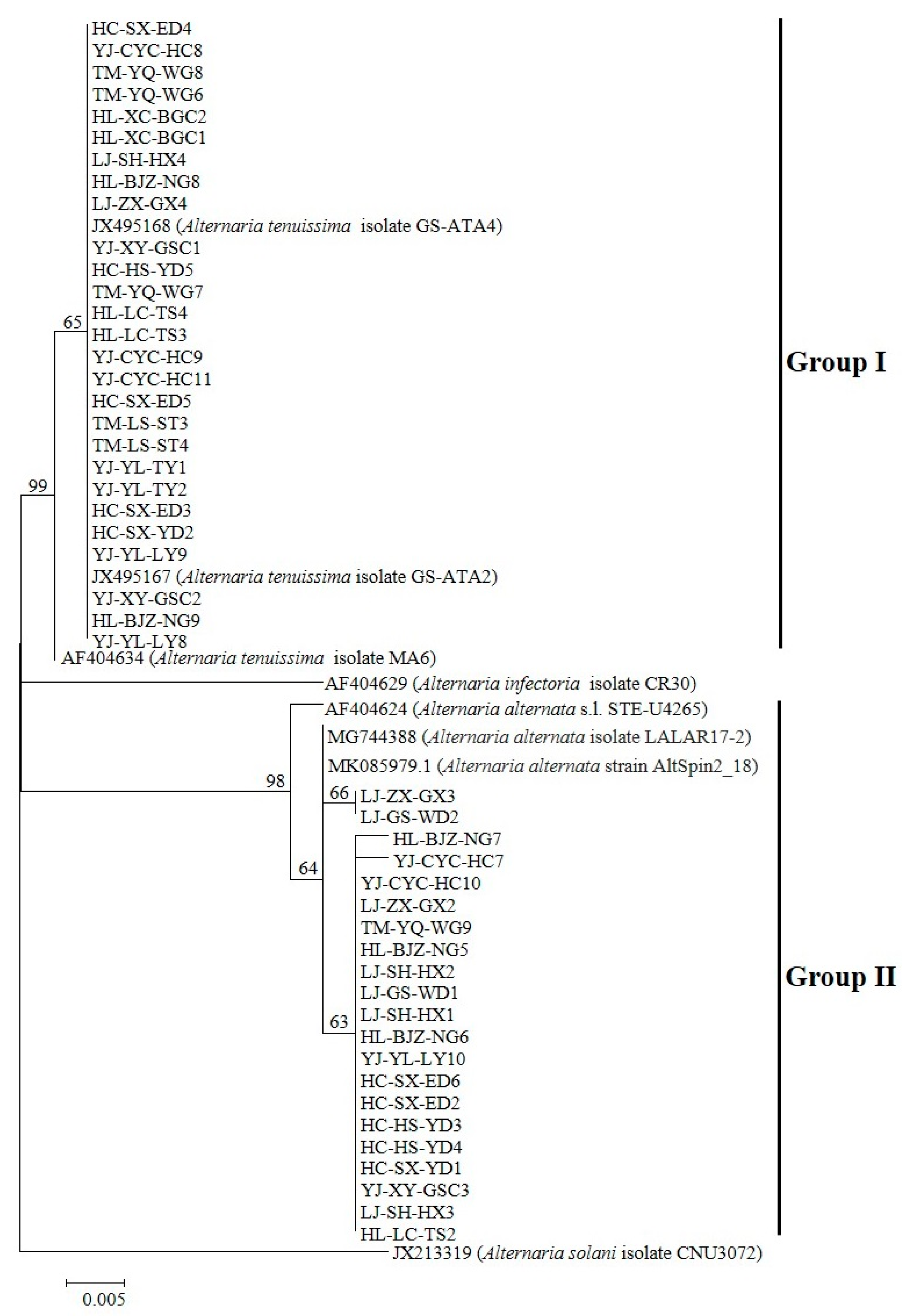 Figure 3. Phylogenetic reconstruction of histone H3 gene sequences (546 bp) resolved 48 Alternaria pathogenic strains into two major clades. Bootstrap support (1000 replicates) and Bayesian posterior probabilities (2M generations) demonstrated (1) Group I (A. tenuissima) with ≥99% support and (2) Group II (A. alternata) with ≥98% support. Outgroup taxa (A. solani isolate CNU3072 (JX213319) and A. infectoria isolate CR30 (AF404634)) were chosen to root the tree at the Alternaria crown group.