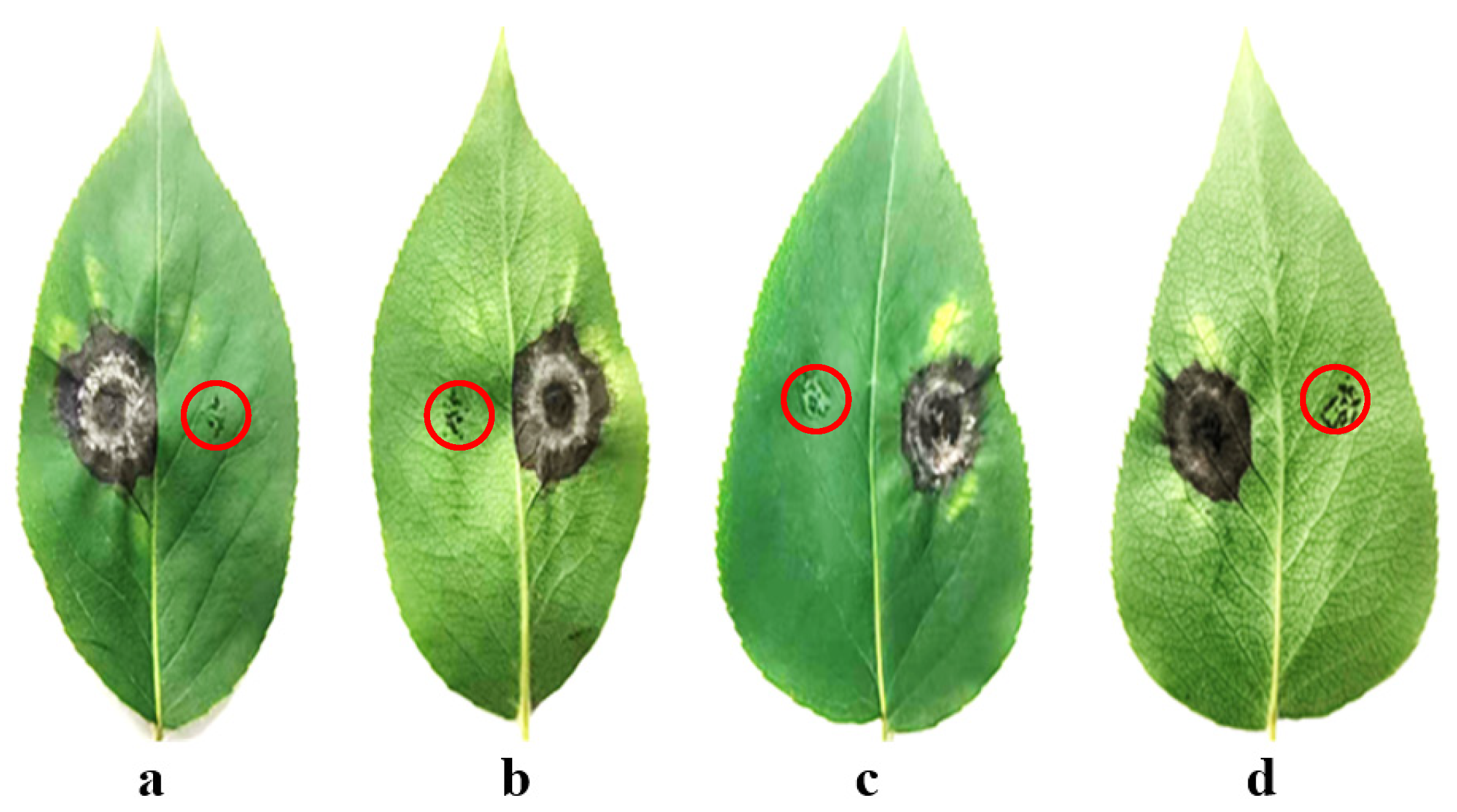 Figure 4. Pathogenicity of 48 Alternaria isolates on detached and healthy Yanbian Pingguoli pear leaves (6 cm long and 3.5 cm wide) naturally grown in Pingguoli pear orchards at the end of May. (a): Adaxial side of the leaf inoculated with A. tenuissima. (b): Abaxial side of the leaf inoculated with A. tenuissima; (c): Adaxial side of the leaf inoculated with A. alternata. (d): Abaxial side of the leaf inoculated with A. alternata.