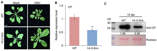 Previous studies have demonstrated that 14-3-3 proteins are key regulators of plant responses to many pathogens [7]. Specially, 14-3-3λ and 14-3-3κ work redundantly in the anti-bacterial and anti-fungal immunity of Arabidopsis thaliana [8]. To further investigate the potential cellular functions of 14-3-3λ and 14-3-3κ in CMV infection, we tested the responses of the 14-3-3λ/κ double-mutant line [20] and WT plants to CMV inoculation. Phenotypic observation at 15 days post-inoculation (dpi) revealed obvious phenotypic differences between the 14-3-3λ/κ double-mutant line and the WT (Figure 1A). Typically, the WT plants displayed abnormal leaf growth after CMV infection (Figure 1A). In contrast, the 14-3-3λ/κ double-mutant plants exhibited few symptoms comparable to the mock-inoculated controls (Figure 1A). The altered leaf morphology, including leaf narrowing and deformation, observed in CMV-infected 14-3-3λ/κ double-mutant plants, along with the relatively larger size of the first two leaves compared to WT, suggests slower symptom development and a potentially reduced susceptibility to CMV. To further quantify CMV accumulation, we performed RT-qPCR and Western blot assays on the CMV-infected 14-3-3λ/κ double-mutant and WT plants. The results consistently demonstrated significantly reduced virus levels in the mutant compared to the WT. Specifically, RT-qPCR showed a substantial decrease in viral CP gene transcription in the 14-3-3λ/κ double-mutant plants (Figure 1B). Correspondingly, Western blot analysis confirmed markedly lower levels of CP protein accumulation in the 14-3-3λ/κ double mutant (Figure 1C). Collectively, these observations imply positive roles of 14-3-3 proteins in the modulation of CMV infection in plants.