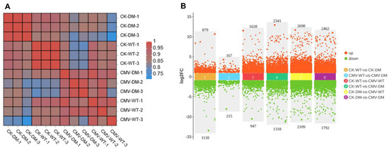 To ensure analytical reliability of transcriptome profiling, the raw reads were rigorously processed using fastp (v0.18.0) to remove low-quality bases, adapter sequences, and short reads. This yielded high-quality clean reads. WT_CK retained 57,585,924; 38,962,372; and 42,983,240 reads. DM_CK retained 43,269,648; 44,057,490; and 43,425,964 reads. WT_CMV retained 45,517,780; 42,345,128; and 43,055,670 reads. DM_CMV retained 41,015,612; 42,836,724; and 41,963,400 reads (Figure S1). Data retention efficiency exceeded 99% across all the samples, with the Q20 scores consistently > 98% (Figure S1), confirming exceptional sequence quality suitable for robust DEG analysis.